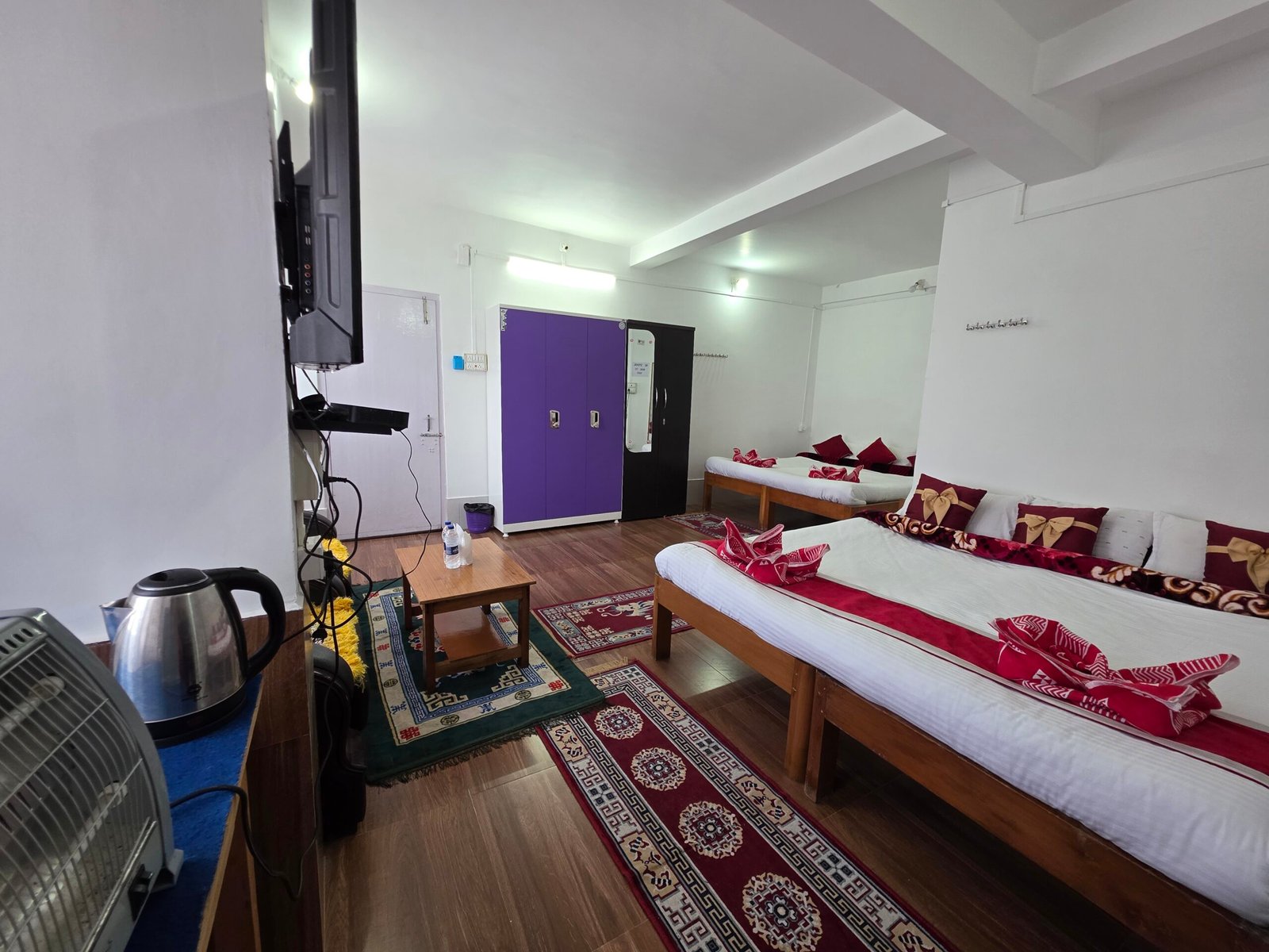 The rooms are spacious and clean and well maintained. All the beds have bed warmers and the host also provides heaters in every room. The floors also have carpets.